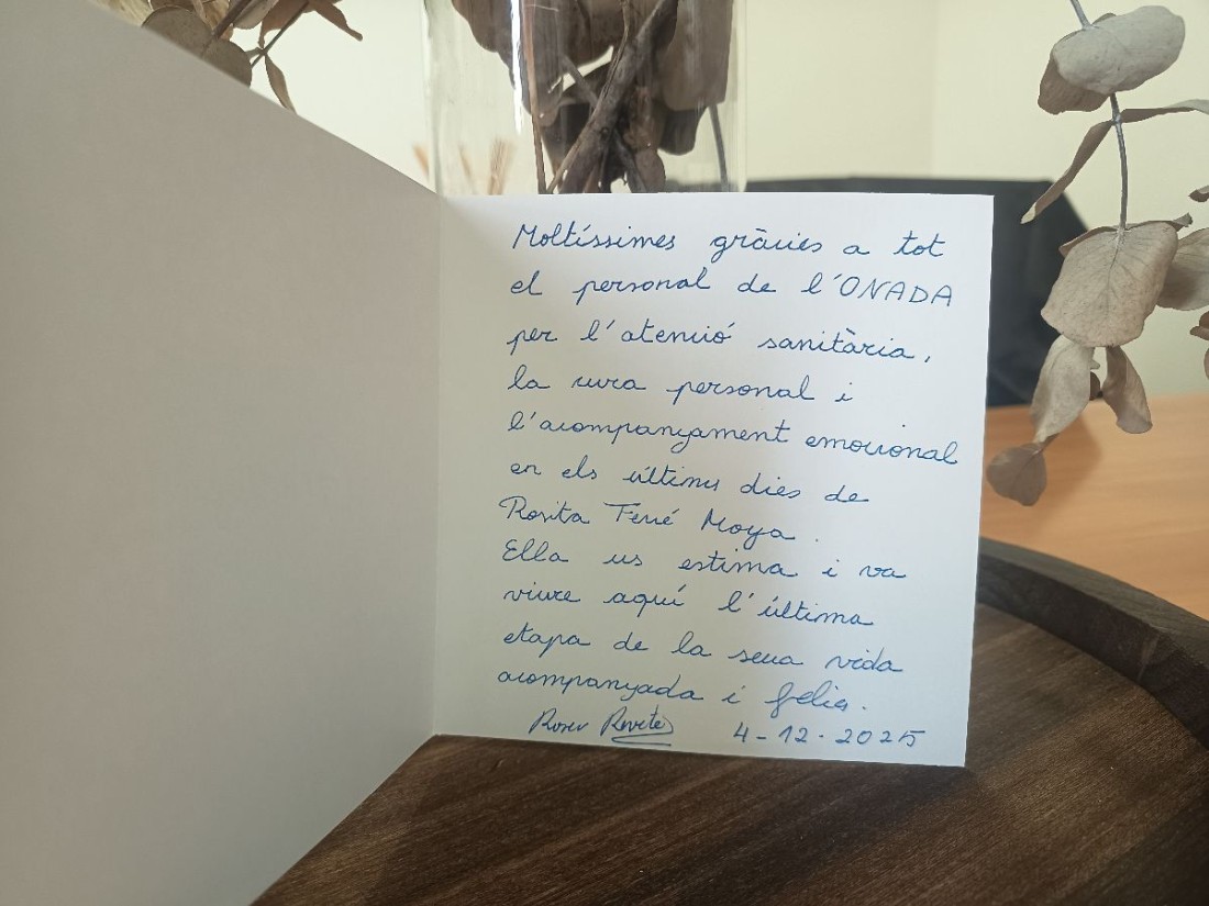 Aquestes notes ens mostren que hem de continuar lluitant per a que la feina surti bé, i la felicitació diu així: Moltissimes gràcies a tot el personal de la Onada per l'atenció sanitària, la cura personal i l'acompanyament emocional en els últims dies de la meva mare. Ella us estima i va viure aquí l'última etapa de la seva vida vida acompanyada i feliç.