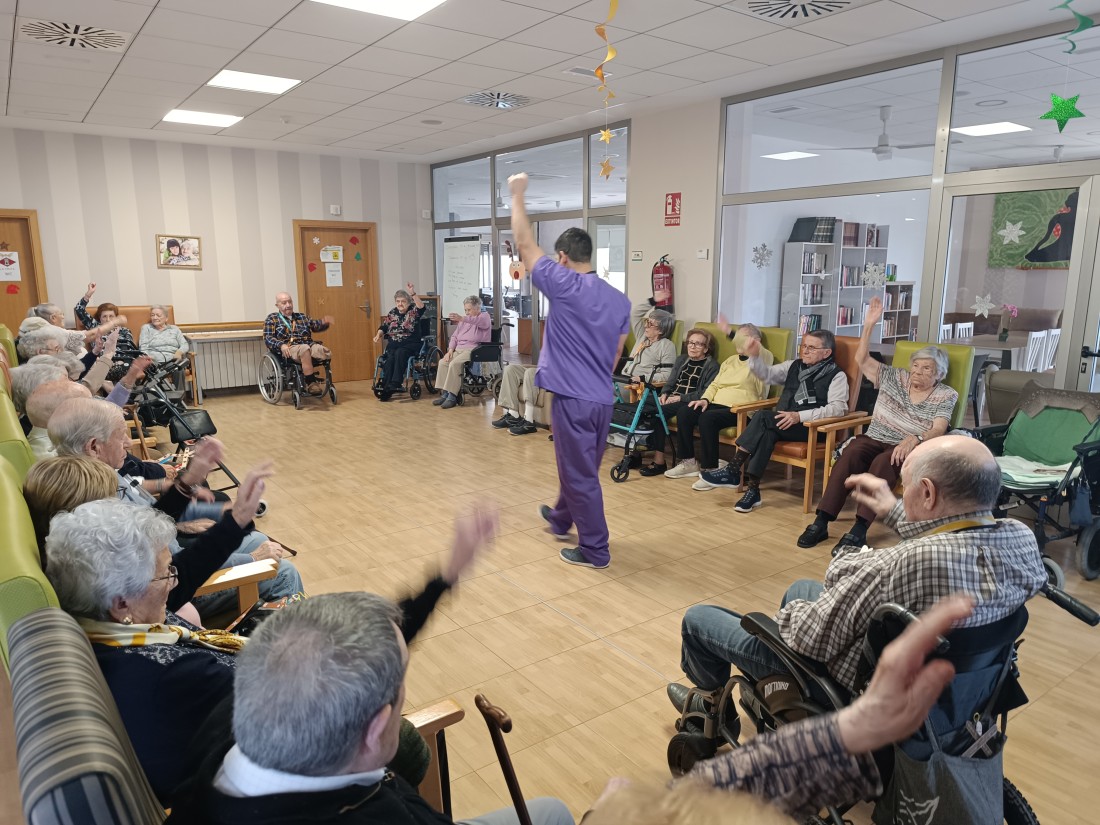 Al menjador de La Petja, tots els matins es realitzar la gimnàstica de manteniment per començar el matí actius i en alegria, amb la companyia del nostre fisio!