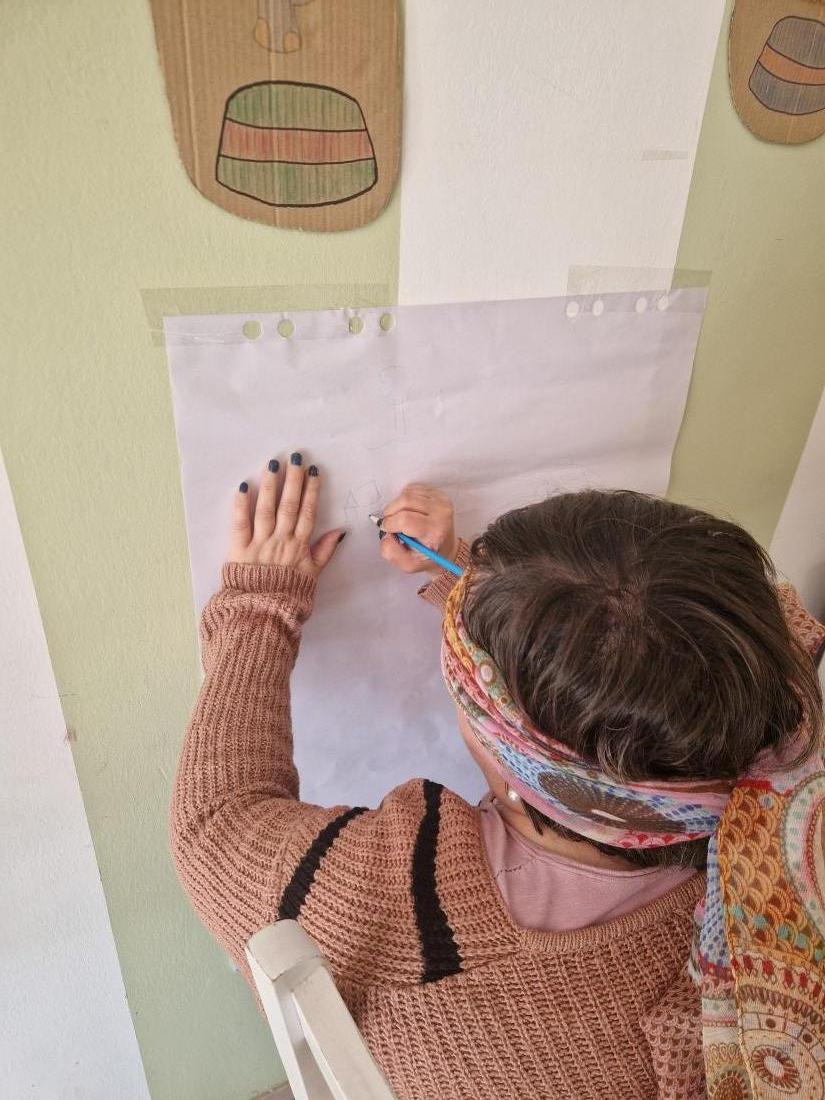 Dibuixem a cegues, amb els ulls tapats, hem de dibuixar el que la companya ens diu.