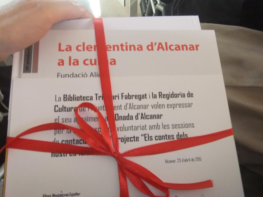 La Biblioteca Trinitari Fabregat i la Regidoria de Cultura de l'Ajuntament d'Alcanar ens van voler expressar el seu agraïment per la tasca de voluntariat que fem amb les sessions de contacontes del projecte "Els contes dels nostres iaios". Ens vam sentir molt orgullosos de poder recollir aquest premi.