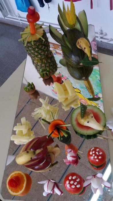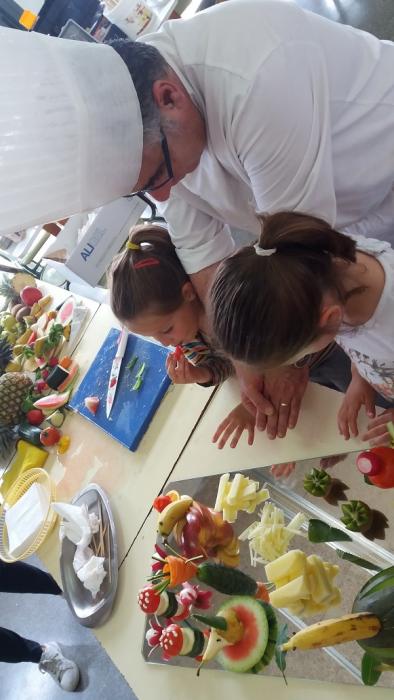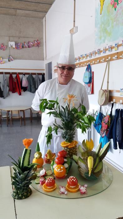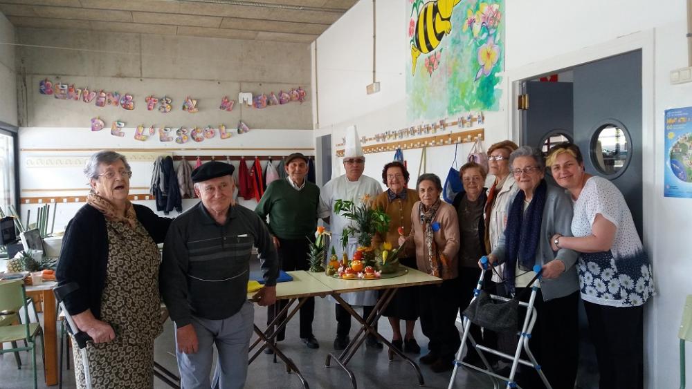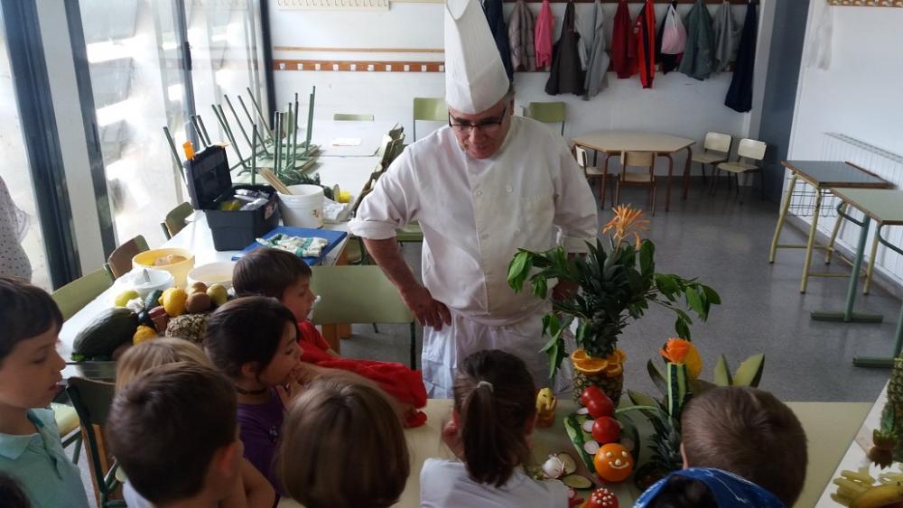 La setmana passada un grup de residents de L'Onada Alcanar i el cuiner del centre, Alfonso Cisneros, vam anar a l'escola del poble a fer un taller de cuina per als més petits. Alumnes, mestres i residents van gaudir veient com el cuiner transformava les fruites en animals i plantes de fantasia. Un goig poder contemplar com van gaudir amb l'espectacle gastronòmic.