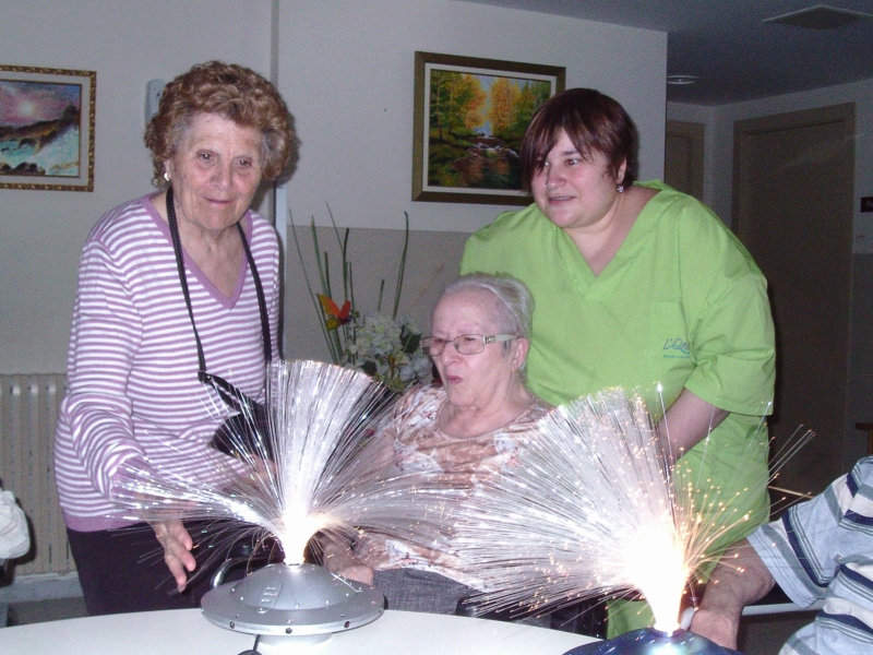 Els jocs de llums, colors i formes ens ajuden a experimentar tot estimulant el sentit visual. D'aquesta manera intentem crear un entorn agradable ajudant-nos de música relaxant i essències aromàtiques per tal de fer el taller el més agradable possible i aportar un estat benefició als nostres residents.