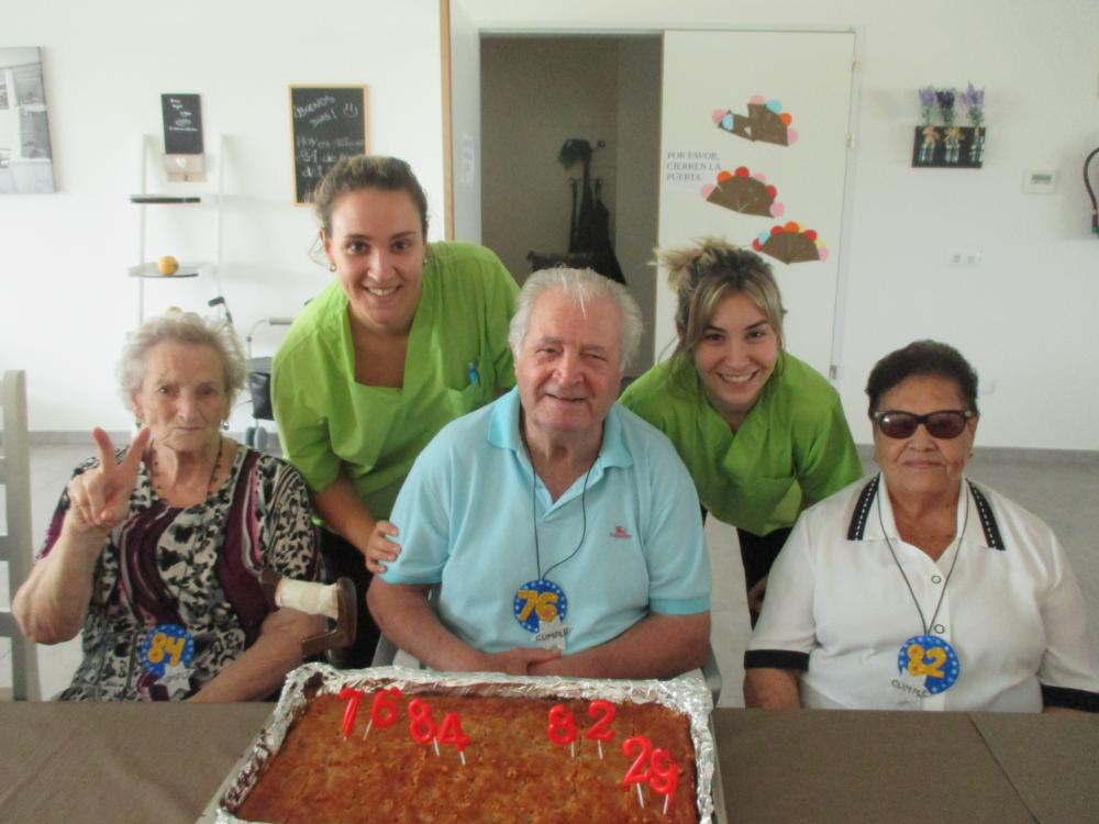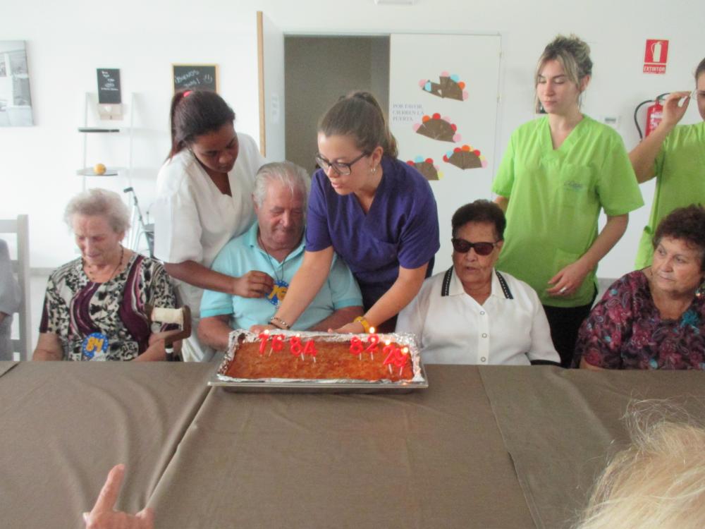 Aquesta mateixa tarda hem celebrat els aniversaris de les persones que han fet anys a l'agost. Els protagonistes han estat Adolfo, Eloina, Maria i Patricia. Hem berenat fulls petits de sobrassada i formatge i, per acabar, una bona coca de figues que vam cuinar ahir nosaltres mateixos.