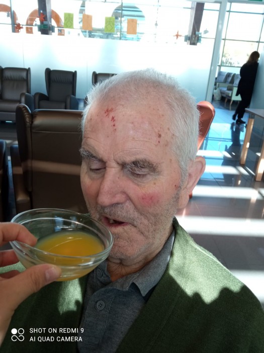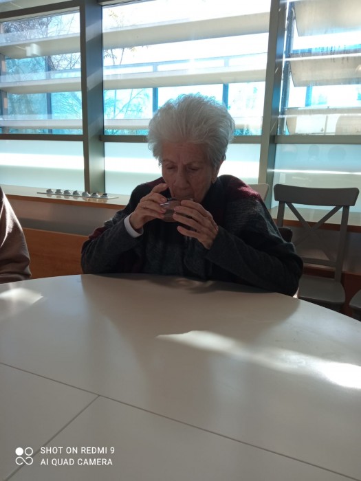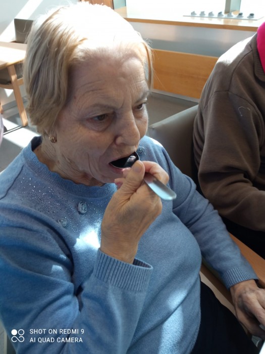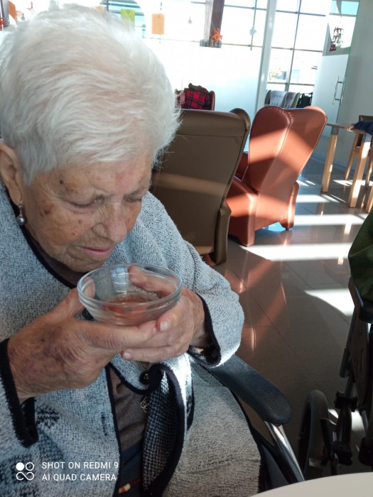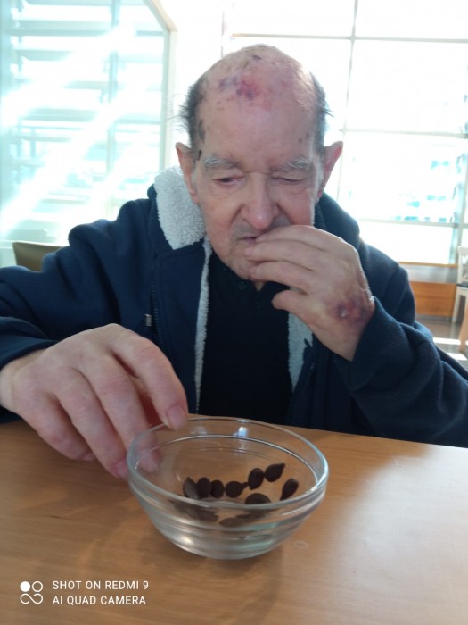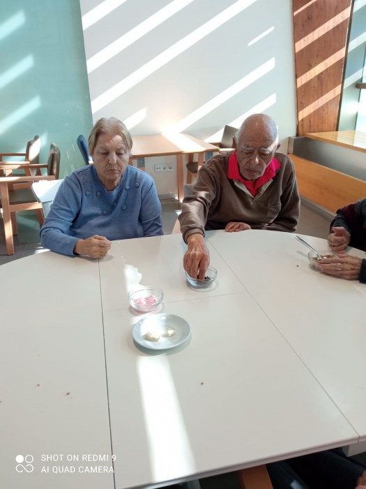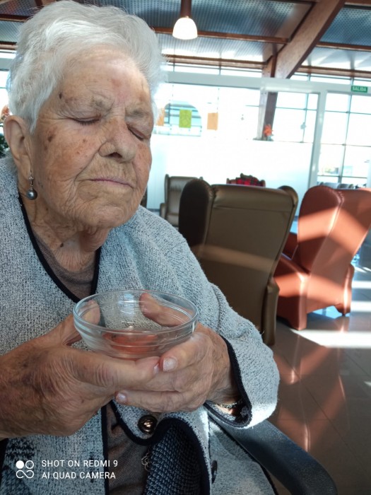 Trabajamos los sentidos adaptándonos a nuestras personas mayores. Así hemos trabajo el gusto y el olfato. Lo mejor las sonrisas y las expresiones de sus caras.
