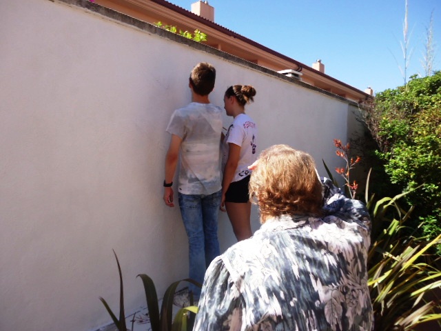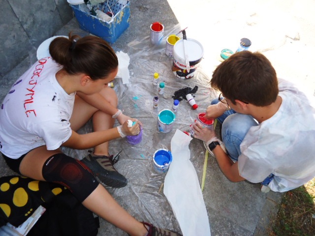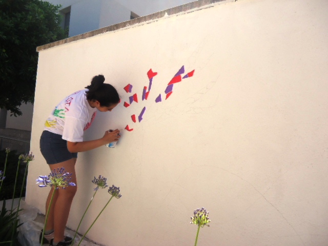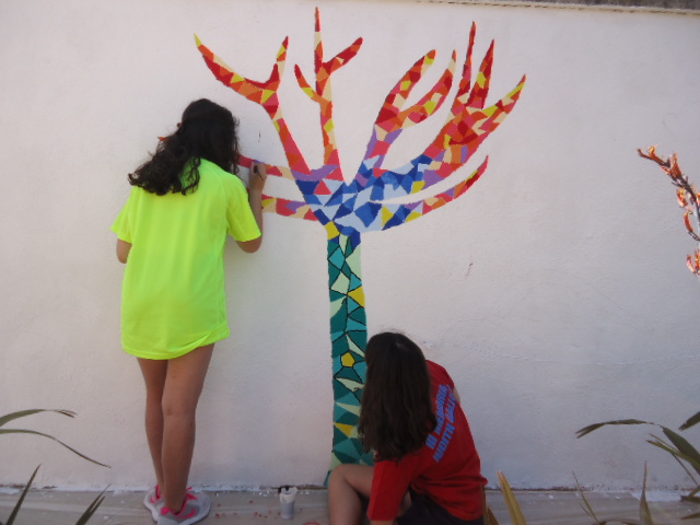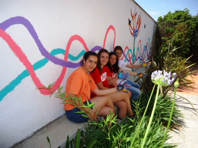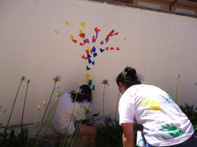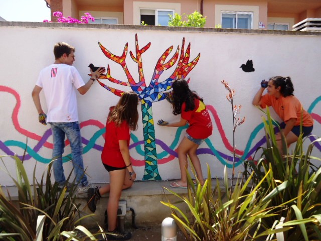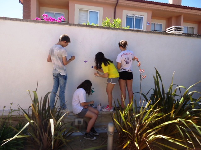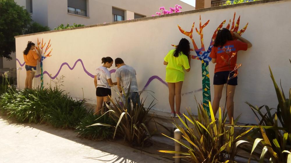 Al llarg de la setmana passada van venir cinc alumnes de 3r d'ESO de l'institut a pintar el dibuix escollit a la paret del jardí del menjador Beat Bonaventura del nostre centre.