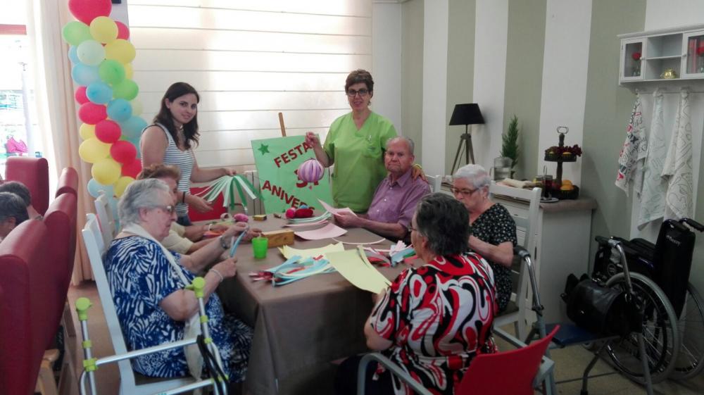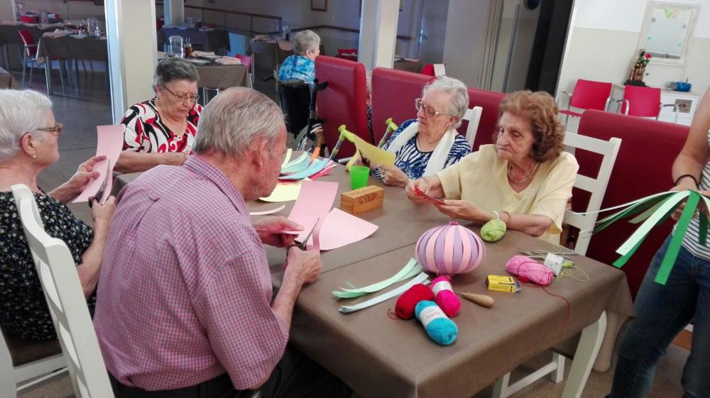 A la residència Les Garrigues ja estem escalfant motors durant tota la setmana per a la celebració de la nit més curta de l'any. Per això, hem fet diversos tallers de guarniments festius per al jardí. Amb llanes de colors, hem fet ulls de Déu, i amb cartolines, uns bonics fanalets.