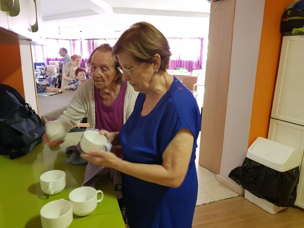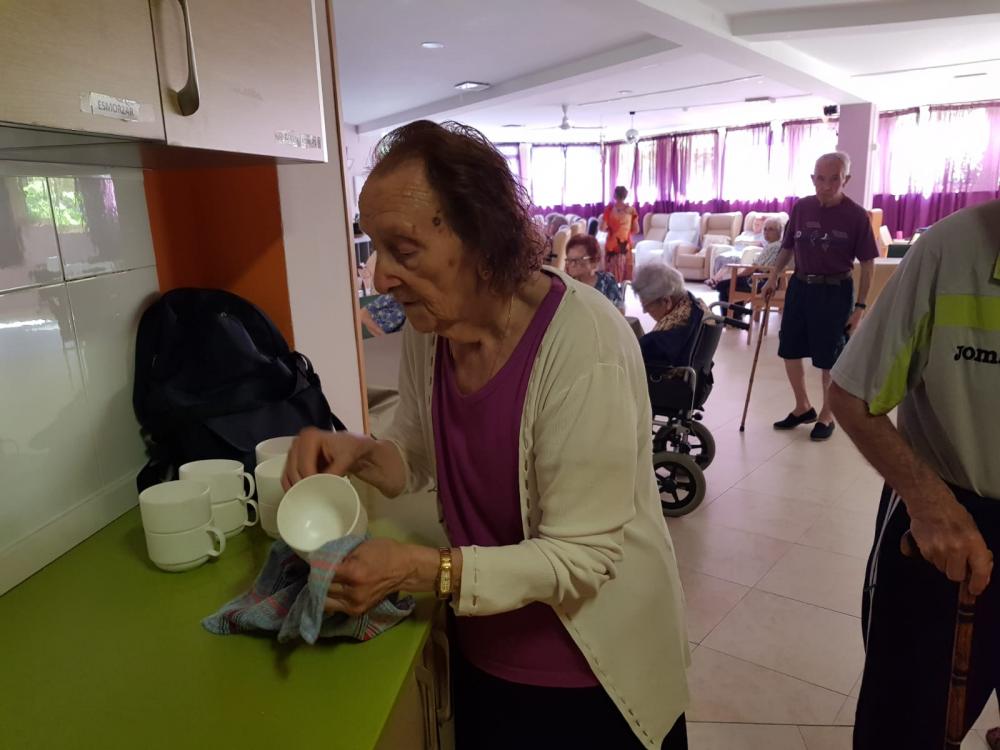 Els nostres residents col.laboren cada dia amb nosaltres en les diferents tasques ocupacionals. Avuí ens ajudaven a secar "l'obra" com diuen ells i a fregar el terra.