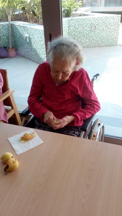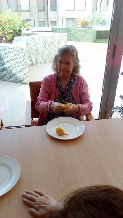 Avui al menjador de Mig Camí, hem fet taller de pelar fruita, ja que per berenar toca Macedonia i l'han preparat els residents.