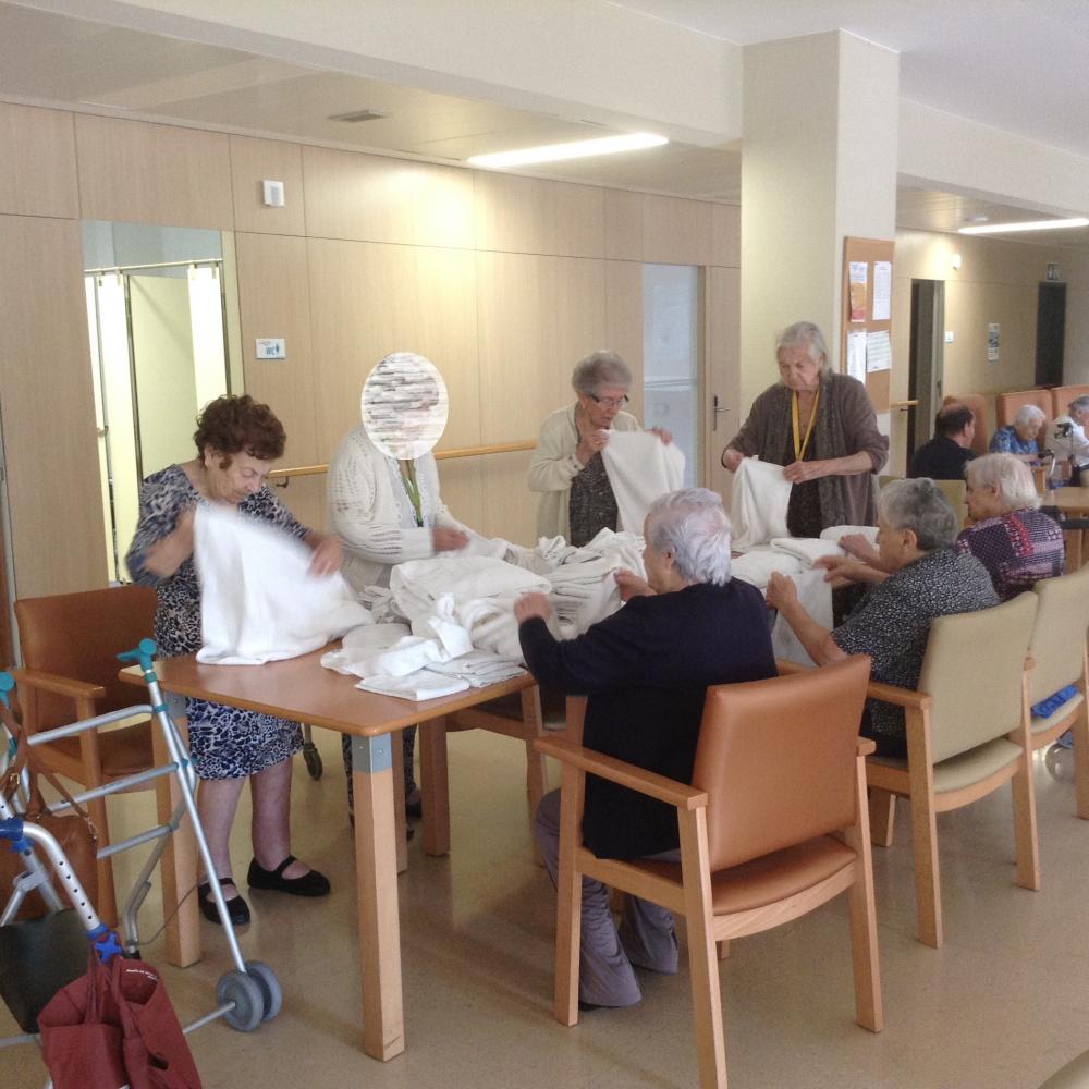 Avui, com quasi cada migdia hem fet taller de bugaderia, on els usuaris participen plegant tovalloles i tovallons.