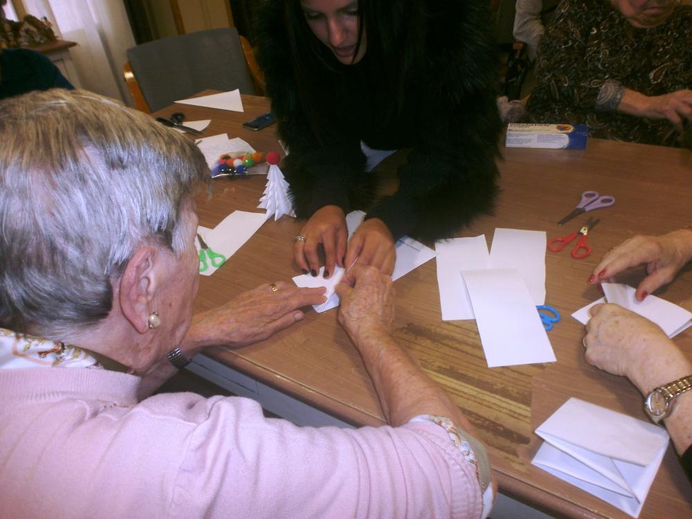 La Carmen, el Pol, el Ramon, la Clàudia i el David, cada dia ens sorprenen amb alguna activitat especial. Avui ens han ensenyat a fer uns arbres nadalencs de papiroflèxia molt originals! També hem continuat preparant la decoració nadalenca del centre.